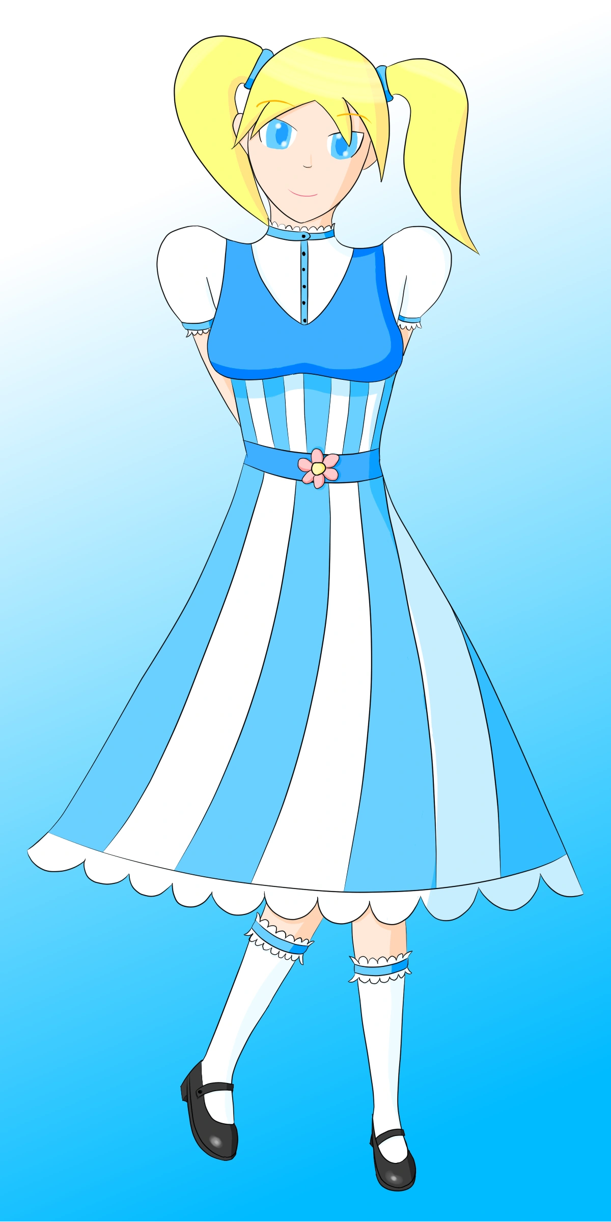Bunny DV normally wears a one-piece dress alongside a long-sleeved shirt, having bowties complimenting the design. She has bunny stockings and wears a pair of shoe-laced boots. She has yellow hair tied into a pair of pigtails, and he has blue eyes.