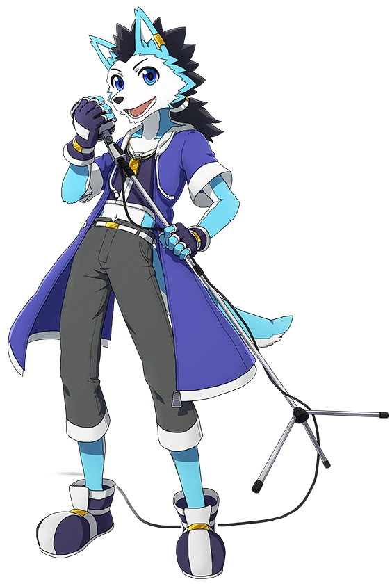 Kemonone Rou is a werewolf with cyan and white fur. He has black hair that fans outwards behind his ears. He wears a blue jacket and a crop top, accompanied by grey long pants. He wears shoes similar to boots, and it's coloured blue as well.
