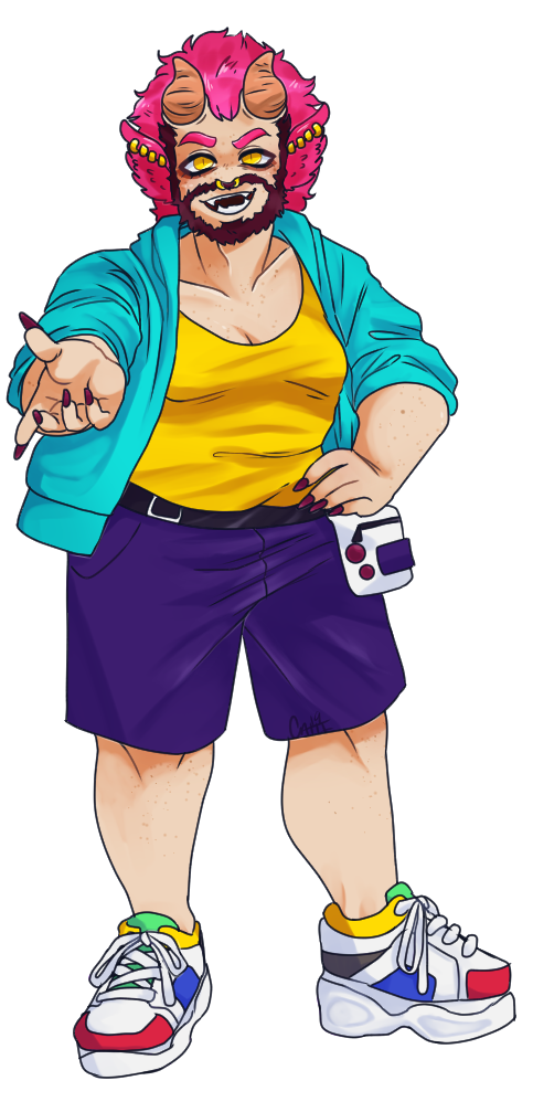 - Headgear - Has pink bat ears with four gold earrings. Orange horns grown on the top of his head. Has a septum piercing.