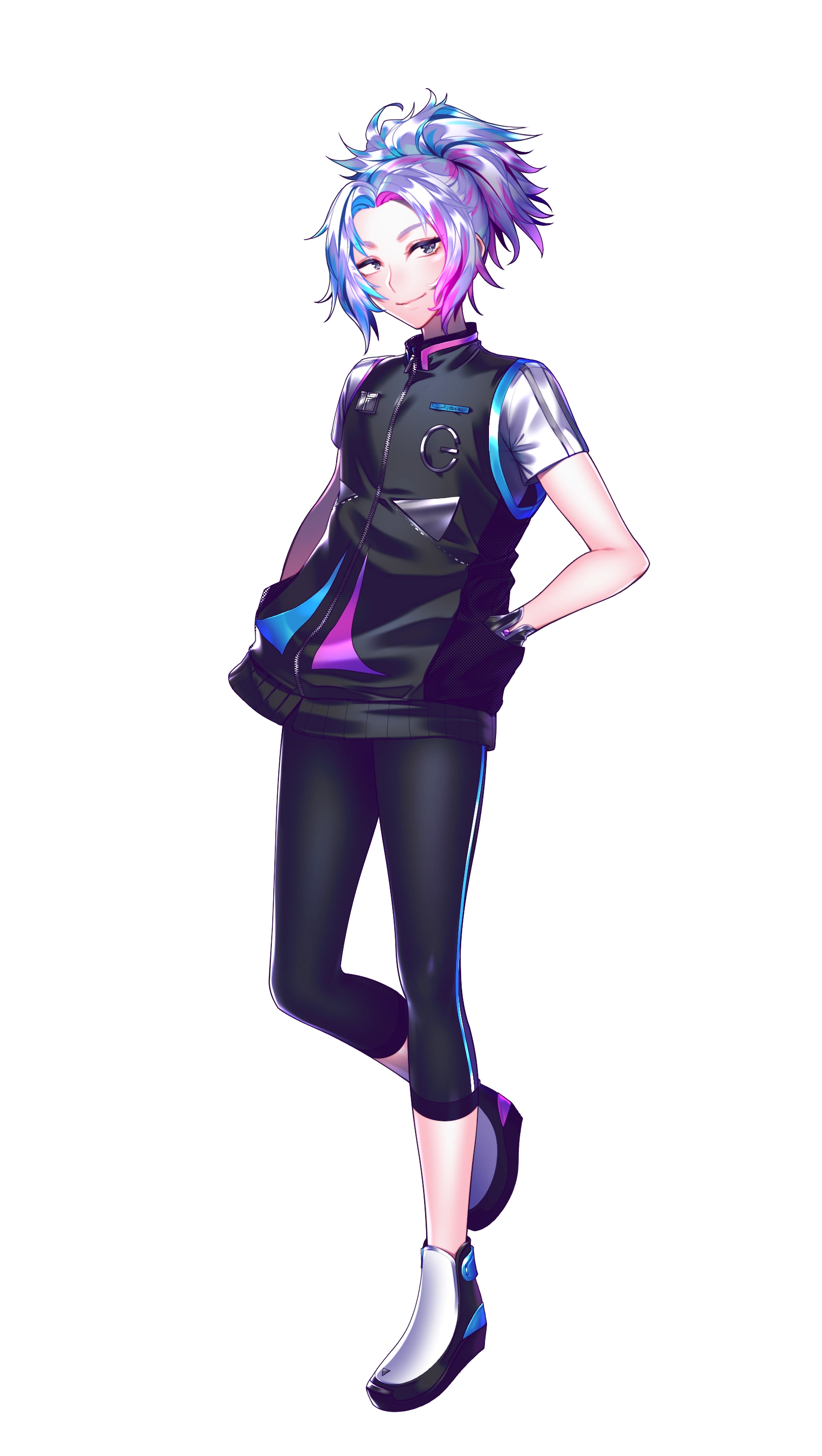 V:GA is of androgynous build and looks. They have pale skin that tends to be rendered white in lower graphic standards, shoulder-length white hair with cyan highlights on the right side and magenta ones on the left side usually tied in a high ponytail and black eyes. They wear a black jacket with white, cyan and magenta embellishments following the vertical split pattern that gets flipped below the waist. Their chest bears a mark resembling a power sign turned 90 degrees clockwise, originally combined with a Commodore logo. Their leggings are either simple black without adornments and their shoes are black and white with cyan (right) and magenta (left) accents. On their hands there are fingerless gloves - the right one is black with a magenta circle and the left one is white with a cyan circle.